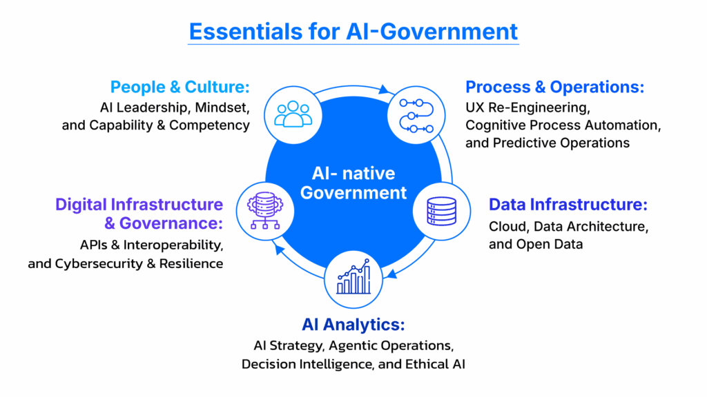 - AI-Native Government – Agentic Intelligence: The advanced stage where AI systems operate autonomously yet ethically, collaborating with humans to deliver predictive, personalized, and data-driven public services.