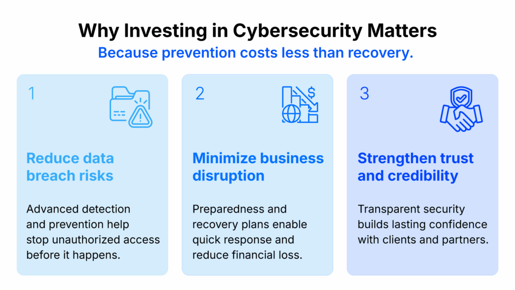 Investing in Cybersecurity is not merely a cost of compliance — it’s an investment in business resilience, reputation, and trust.