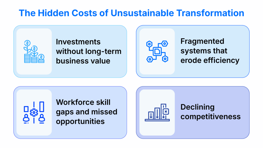 Without sustainability, transformation efforts risk becoming liabilities — generating hidden costs and risks that undermine long-term value across four critical areas: